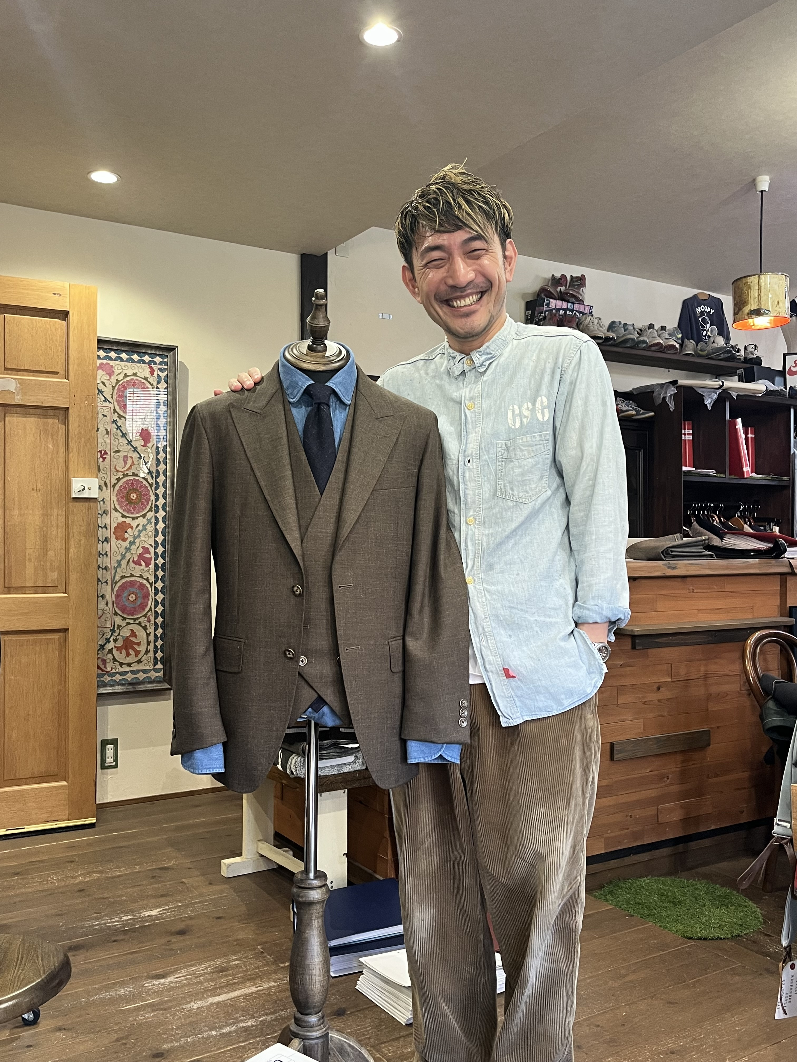 店主の鈴木さんです。テーラーなのにスーツを着ないスタイル。(笑)