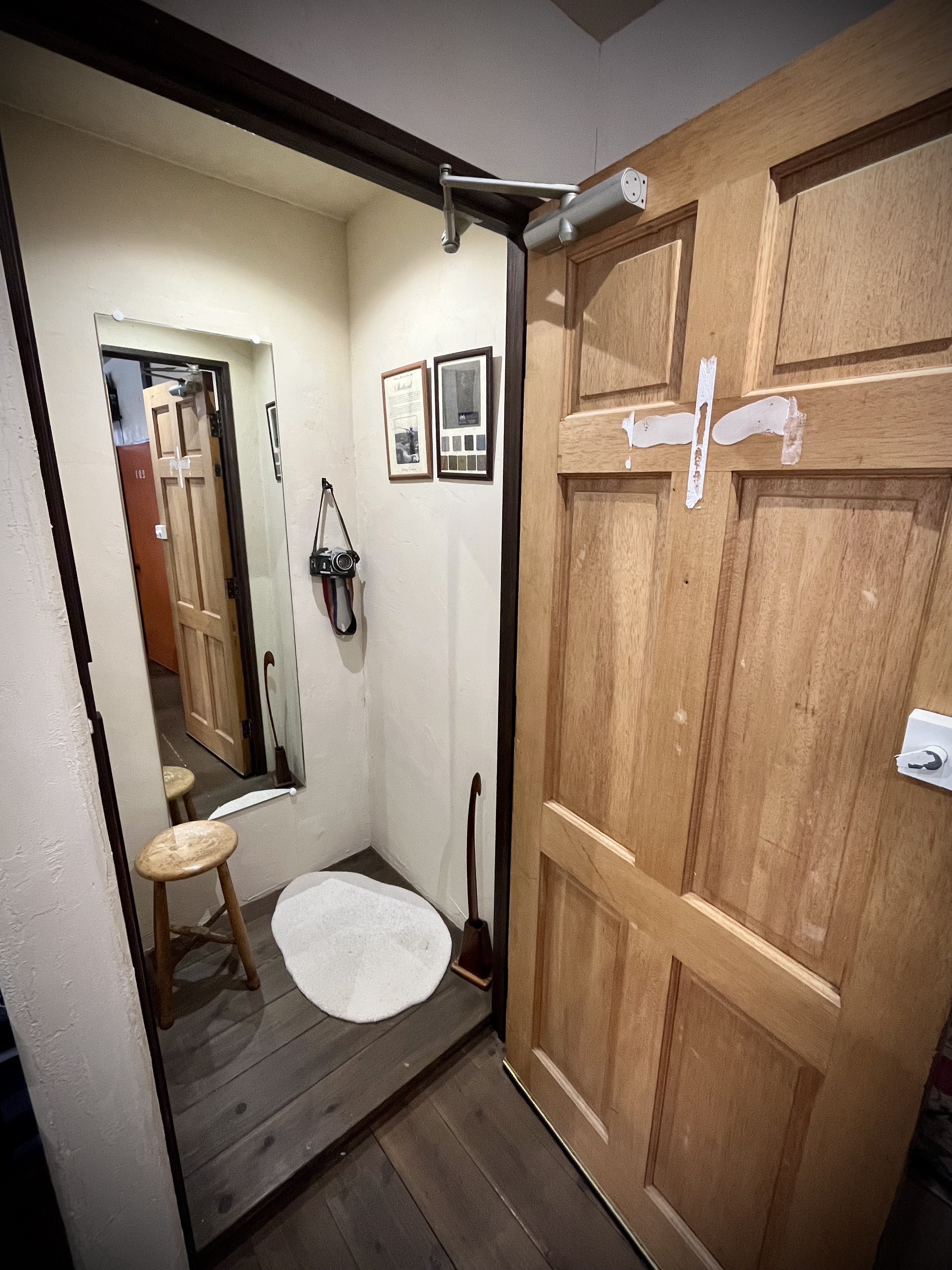 島根県大田市で生まれた島根県産ウールマット、イギリスのアンティークドアを使用したフィッティングルーム。実は靴ベラにもこだわりが...