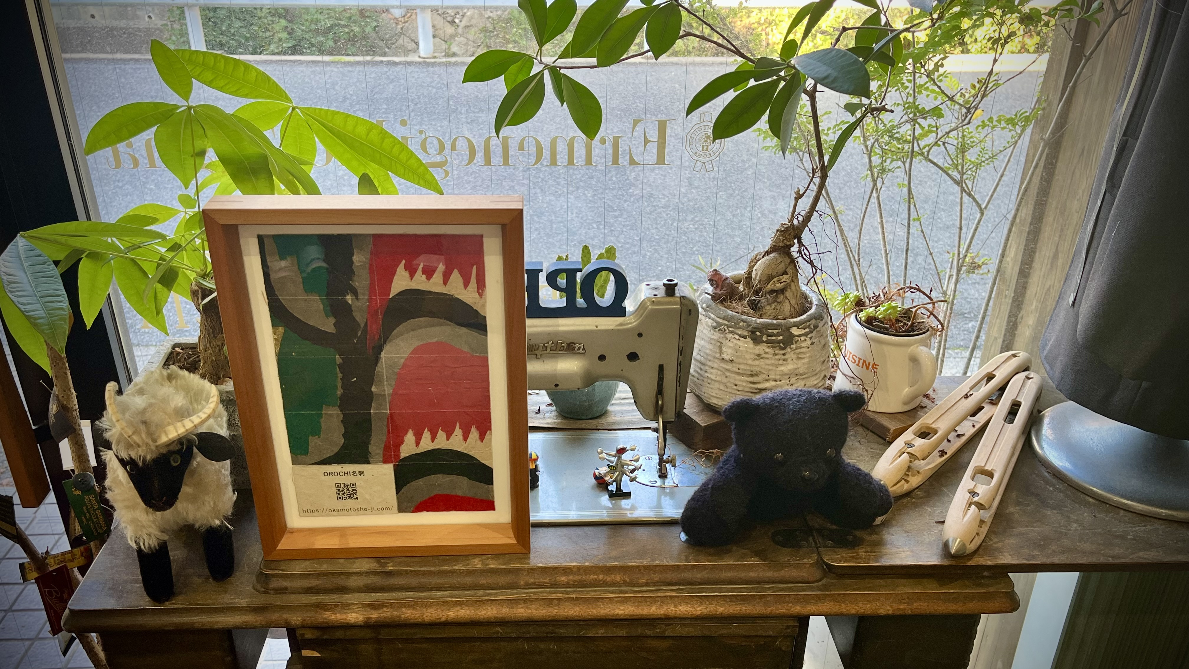 思い入れのあるアンティークミシン、岩見神楽の大蛇和紙、非売品やヴィンテージのぬいぐるみなど、一つ一つにこだわりがある一角です。